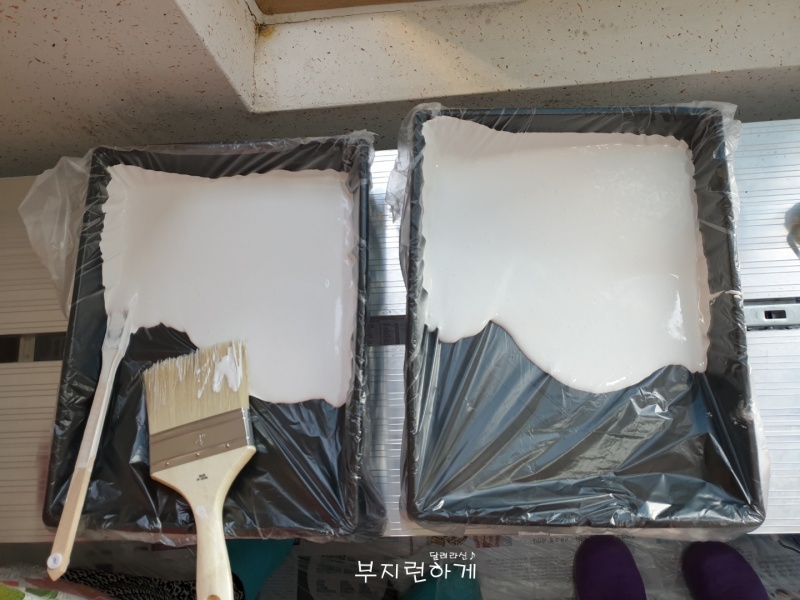미리 비닐로 씌어논 페인트롤러트레이에 결로방지제를 덜어낸뒤 엄마와 함께 도포를 열심히 했어요.