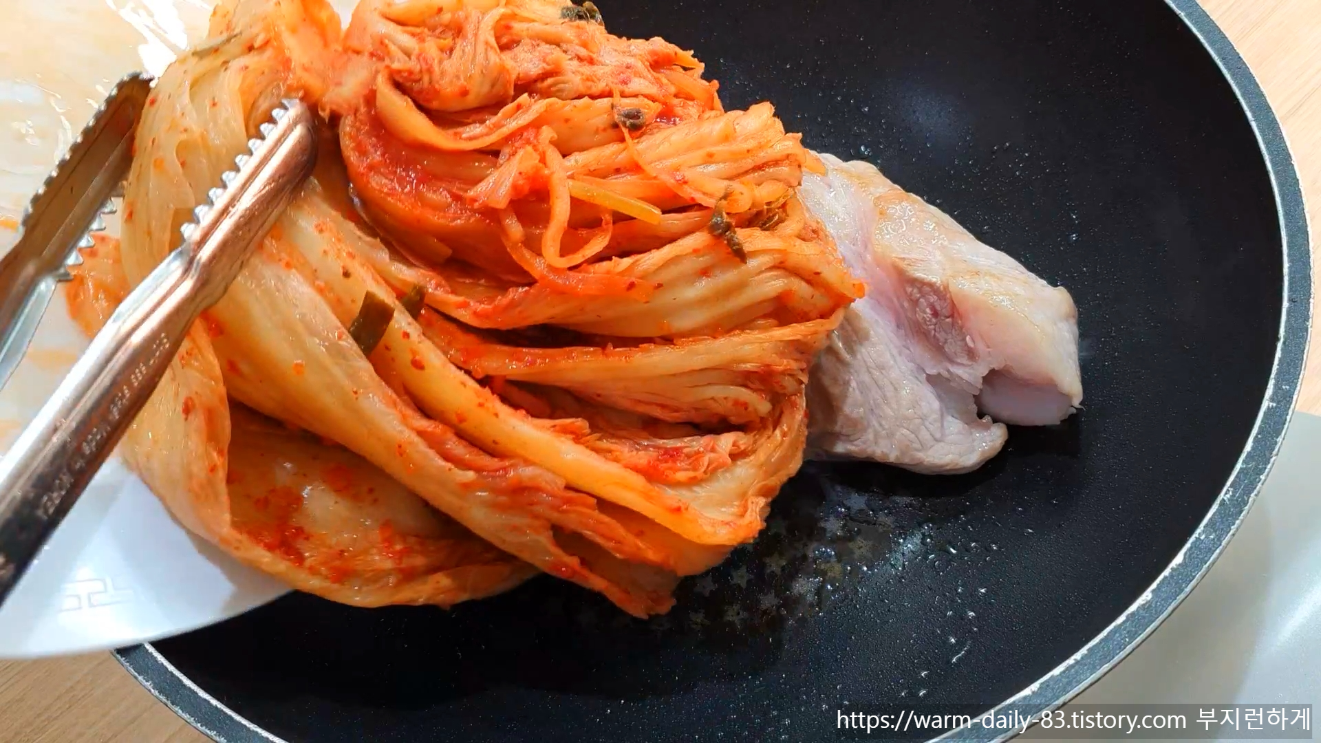 ✔ 잘 익은 김치에 고기를 올린 다음